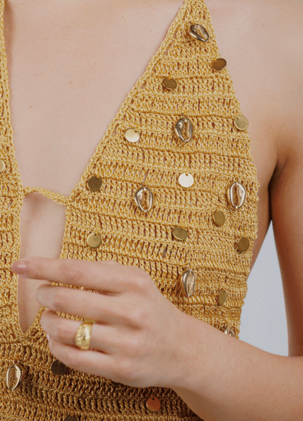Indispensável no seu passeio praiano. A Blusa Dália combina o charme do crochê em cor dourada com bordado à mão e amarração nas costas, entregando um visual moderno e feminino — a tendência do verão. Detalhe especial com motivo de elefante que dá personalidade à peça.