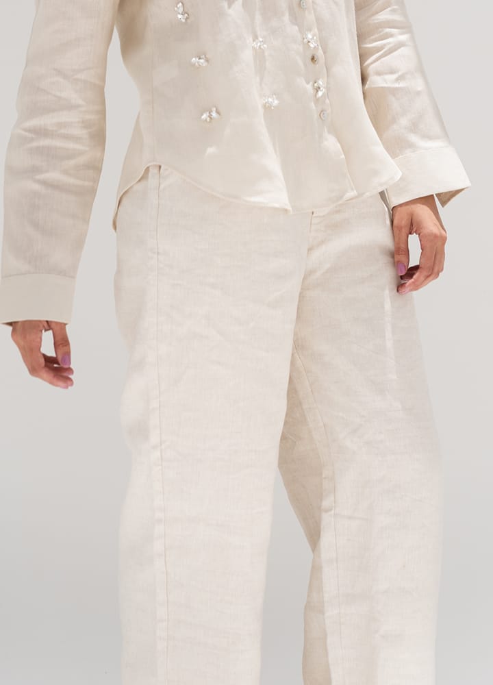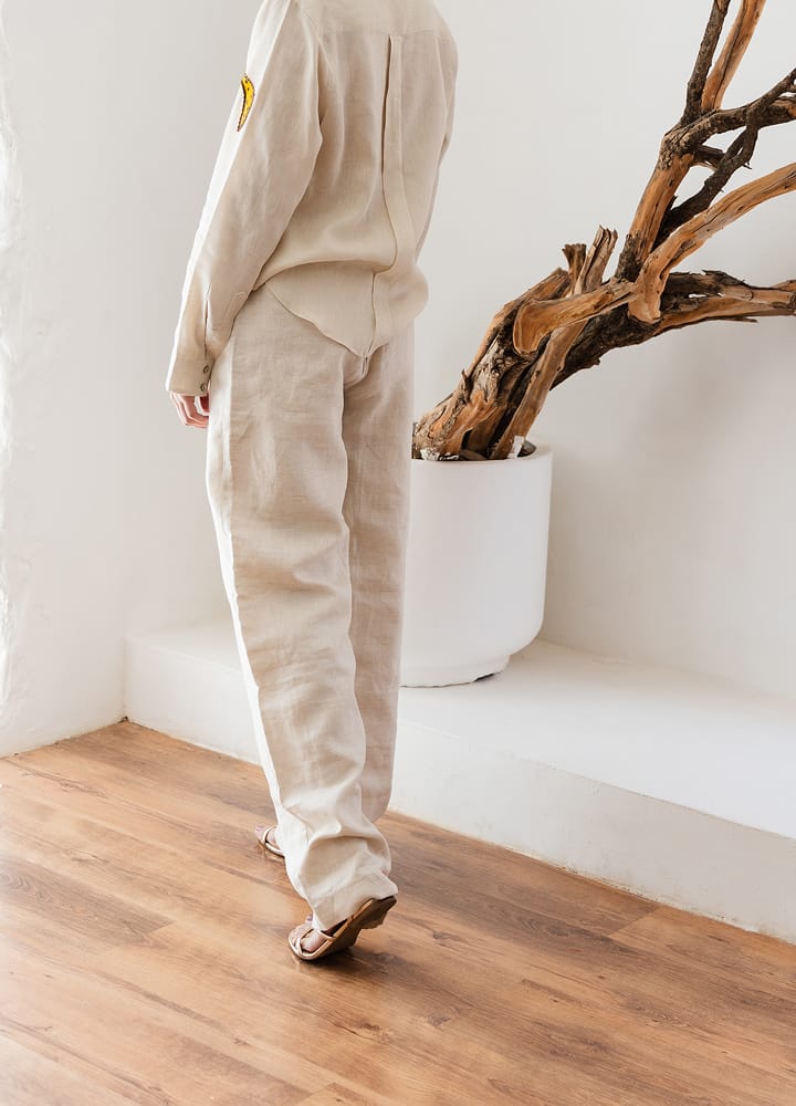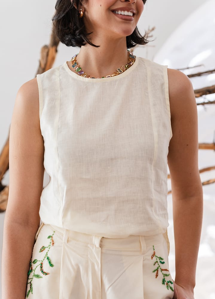 Sobre biquíni, com saia de linho, short de alfaiataria ou pareô. Finalize com sandálias e acessórios naturais.