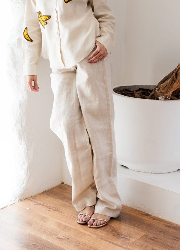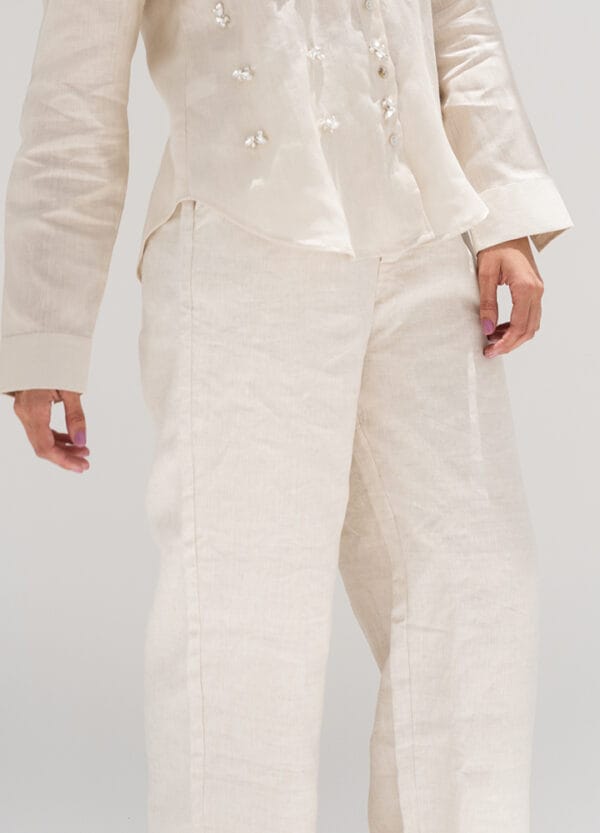 Clássica, elegante e atemporal, a Calça Geovana é feita em linho puro, com caimento leve e sofisticado — essencial no guarda-roupa e perfeita para compor looks do dia à noite.