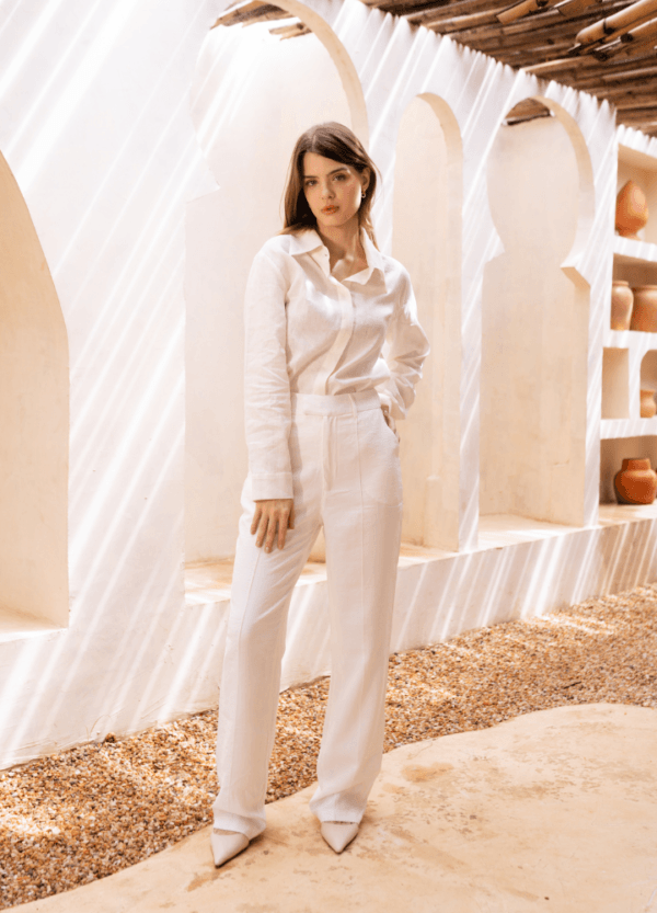 Leve, elegante e versátil, a Calça de Viscose em offwhite tem caimento fluido e toque macio — uma peça curinga que transita do dia à noite.