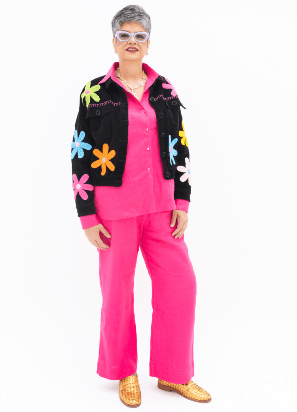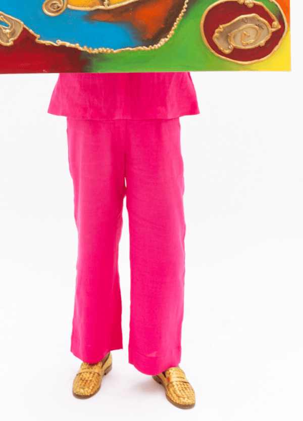 A tonalidade pink vibrante confere personalidade e modernidade à peça, tornando-a ideal para composições que transitam do casual chic ao elegante contemporâneo. O linho, por ser um tecido natural, proporciona frescor, respirabilidade e um toque artesanal, reforçando o caráter atemporal da calça.