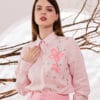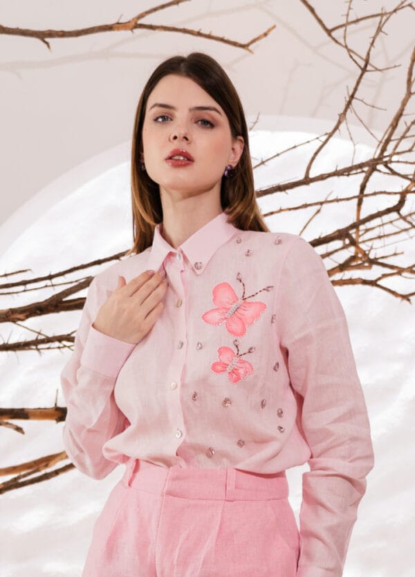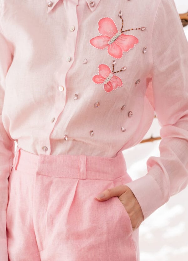 Clássica, clean e elegante. Une o frescor do linho ao encanto de borboletas pintadas à mão e bordado artesanal — um trabalho que transforma o look em algo único e sofisticado.