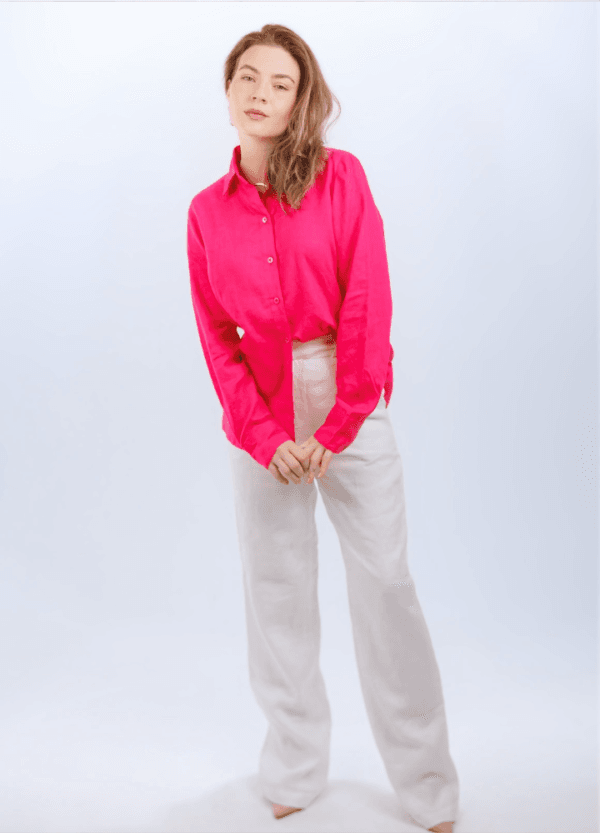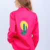 Autoral e cheia de charme: camisa em linho rosa com sol e cacto pintados e bordados à mão, unindo leveza, cor e sofisticação — perfeita do dia à noite.