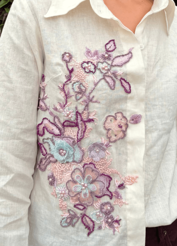Camisa em linho natural, com modelagem clássica e toque leve, que garante conforto e sofisticação. O grande destaque fica por conta do bordado artesanal floral em tons suaves de lilás, rosa e azul, aplicado de forma orgânica na parte frontal da peça, criando um visual delicado, artístico e exclusivo. Possui gola tradicional, fechamento frontal por botões e mangas longas, permitindo diferentes propostas de uso — do casual chique ao elegante despretensioso.