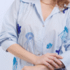 Um verdadeiro oceano de lindeza. Em azul candy, esta camisa em 100% algodão recebe bordados à mão de águas-vivas, conchas e estrelas-do-mar, trazendo frescor, charme e um toque lúdico ao look.