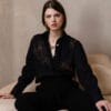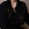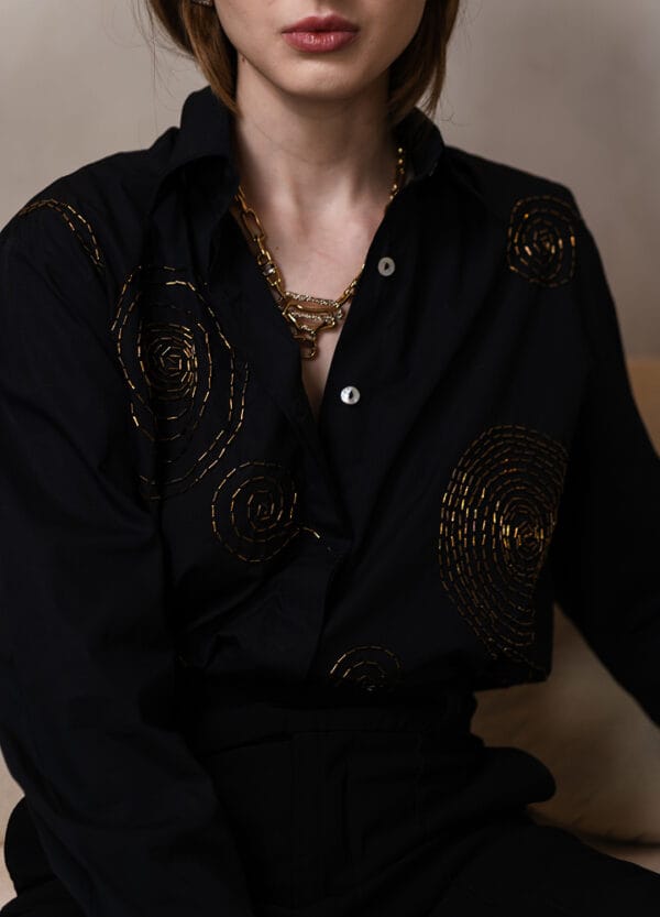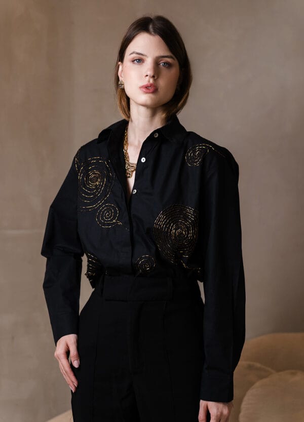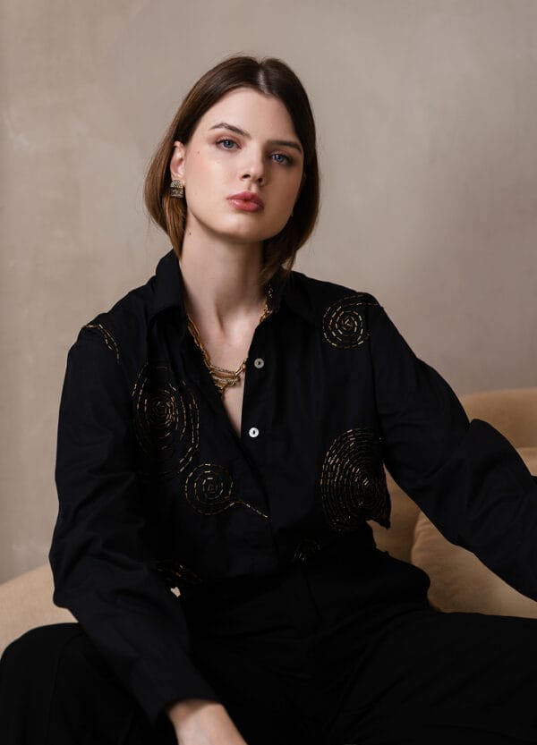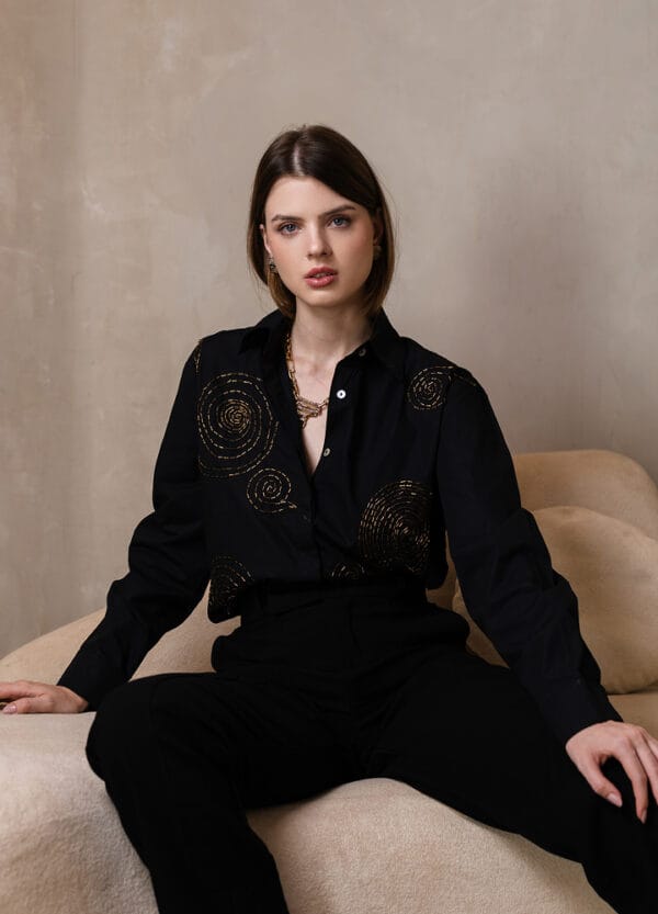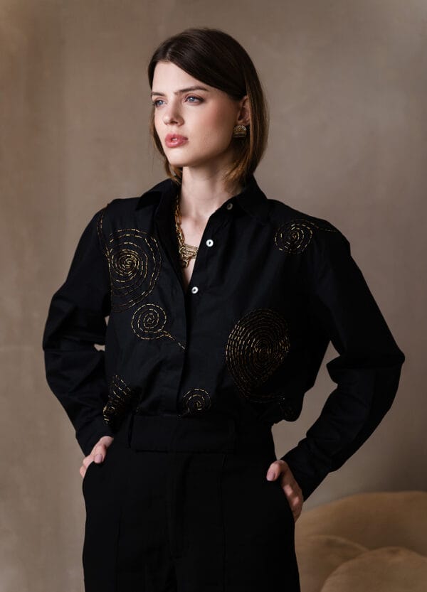 Clássica, elegante e versátil, a Camisa Solar é feita em linho puro e recebe bordado à mão com formas circulares, trazendo textura autoral e caimento fluido — perfeita do dia à noite.
