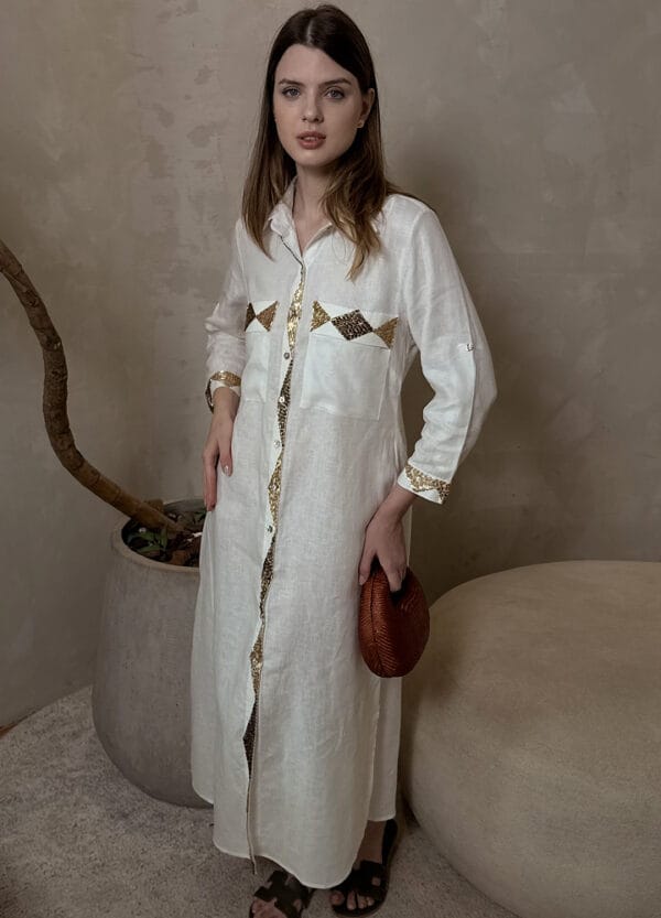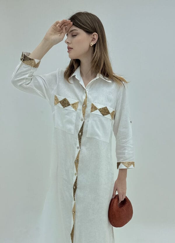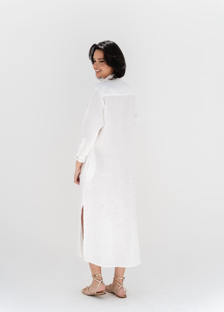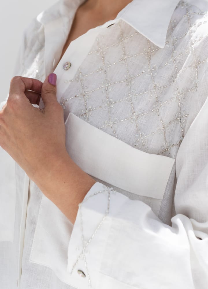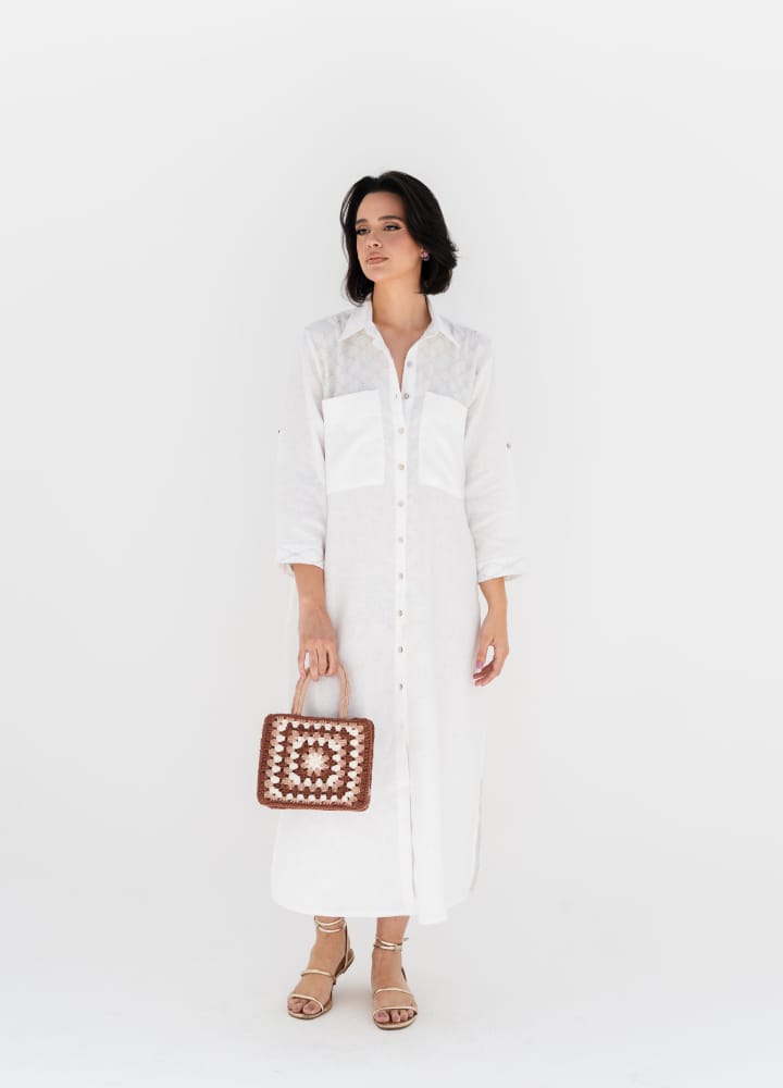 Elegante, atemporal e refrescante, a Chemise Bia é inspirada na mulher de alma solar e autêntica. Confeccionada inteiramente em linho puro, recebe bordados à mão de cima a baixo, incluindo mangas e bolsos, tornando cada peça única e especial.