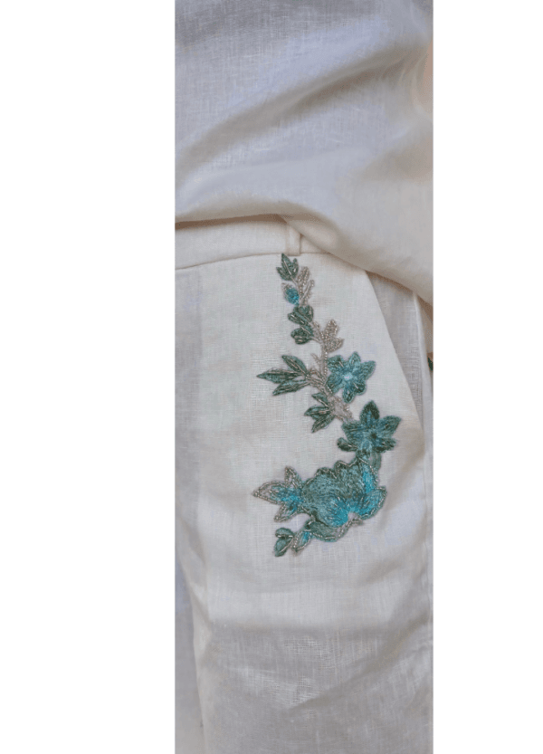 A calça tem caimento reto, cintura média, bolsos funcionais e detalhes bordados que conversam com a camisa, garantindo harmonia e exclusividade ao conjunto.