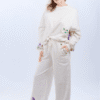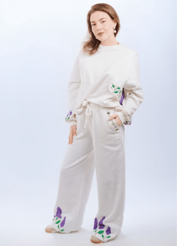 Delicado e sofisticado, o Moletom Alfazema traz alfazemas pintadas à mão e folhas pintadas e bordadas, criando um ponto de arte sutil no look. Confortável e versátil, é ideal para seu aerolook — perfeito para viajar com estilo.