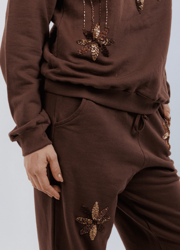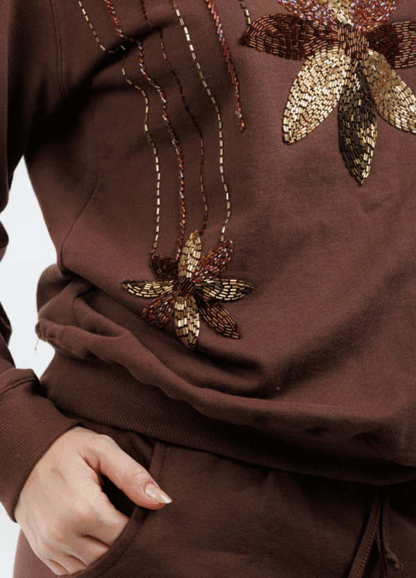 Delicado e sofisticado, esse moletom chega em marrom com flores bordadas à mão em tons terrosos — um toque artesanal que eleva o básico. Confortável e versátil, é perfeito para seu aerolook e para composições do dia a dia.