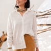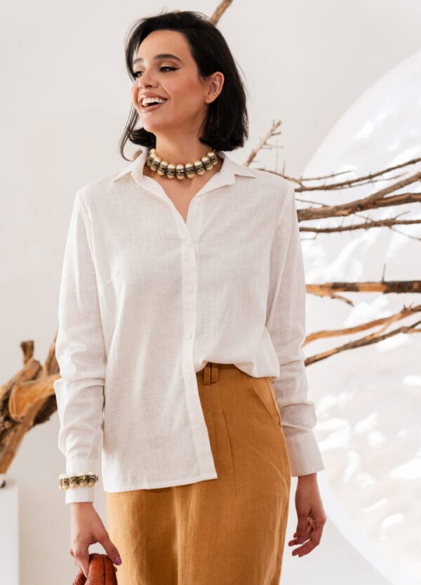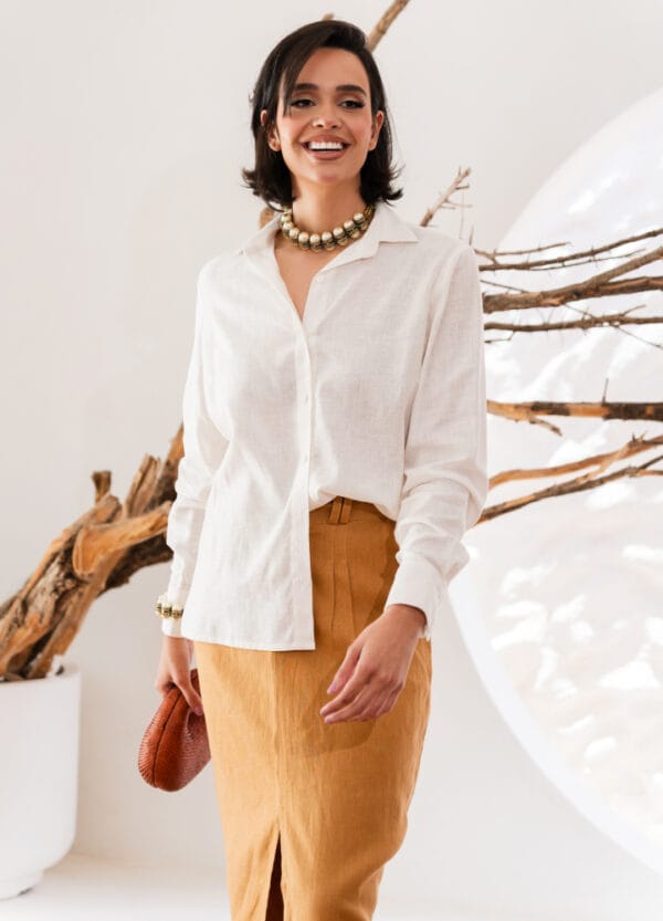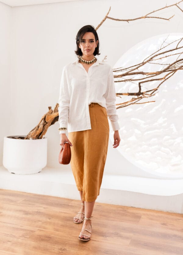 Com camisa branca de linho para um office chic, ou top neutro e sandália para a noite. Fica impecável com blazer off-white.