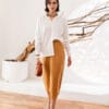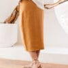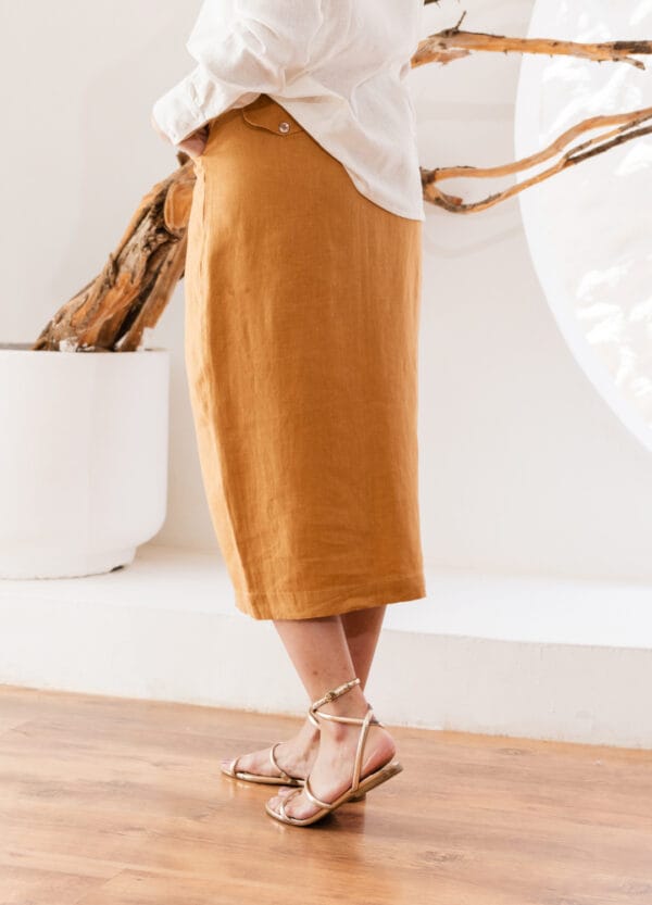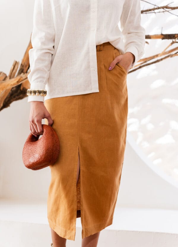 Saia DOT — 100% linho, lápis midi com fenda frontal